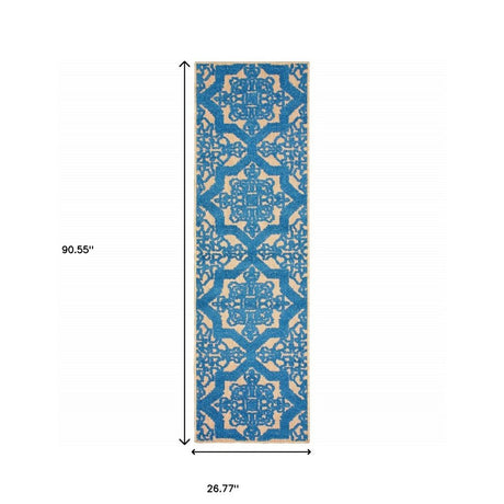 2' X 8' Blue and Beige Stain Resistant Indoor Outdoor Area Rug