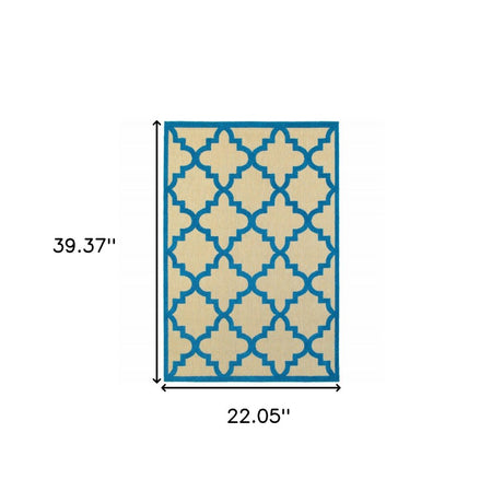 2' X 3' Blue and Beige Geometric Stain Resistant Indoor Outdoor Area Rug