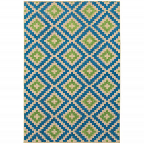 7' X 10' Blue and Beige Geometric Stain Resistant Indoor Outdoor Area Rug