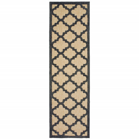 2' X 8' Beige and Black Geometric Stain Resistant Indoor Outdoor Area Rug