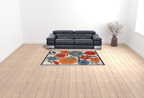 4' X 6' Ivory Blue and Orange Floral Non Skid Indoor Outdoor Area Rug