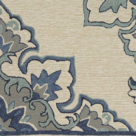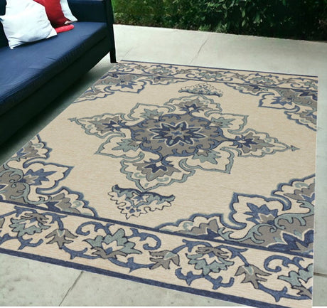 5' X 8' Ivory And Blue Damask Indoor Outdoor Area Rug
