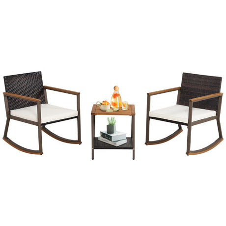 3 Pieces Rattan Rocking Bistro Set with Coffee Table and Cushions-Off White