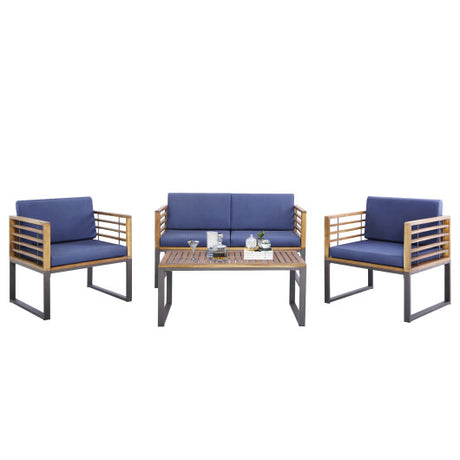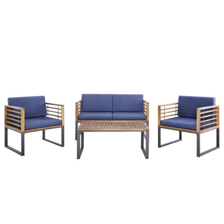 4 Piece Patio Acacia Wood Conversation Set with Soft Seat-Navy