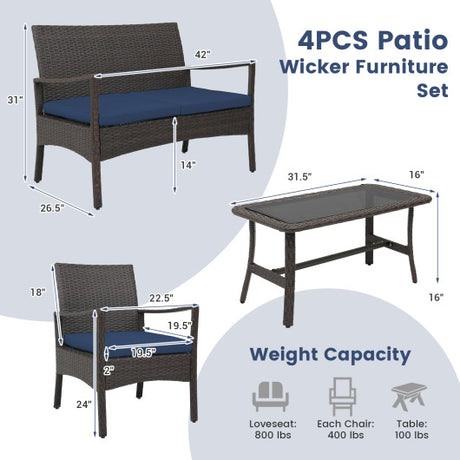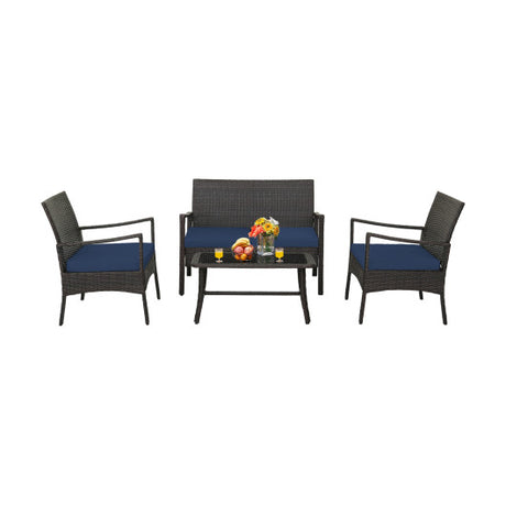 4 Pieces Outdoor Rattan Conversation Set with Tempered Glass Coffee Table-Navy