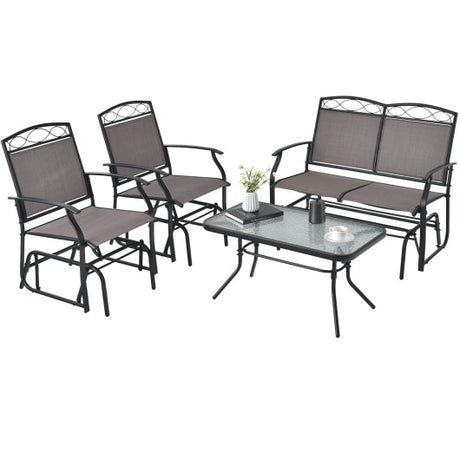 4 Piece Patio Glider Conversation Set with Tempered Glass Table Top-Brown