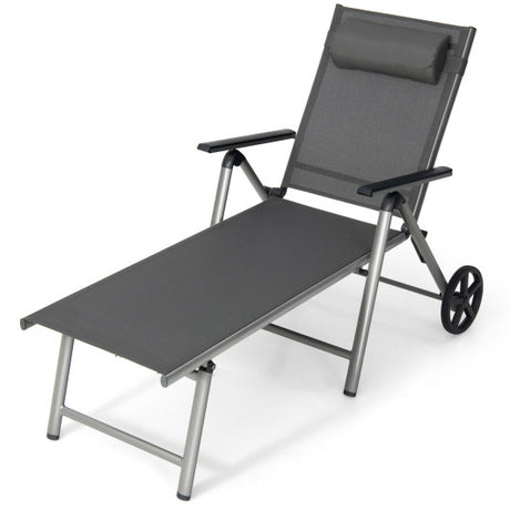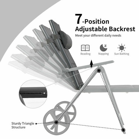 Patio Lounge Chair with Wheels Neck Pillow Aluminum Frame Adjustable-Gray