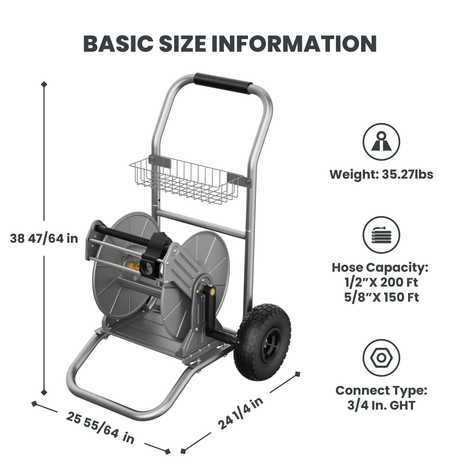 Garden Hose Reel Cart-2 Wheels-Stainless Steel-Heavy Duty