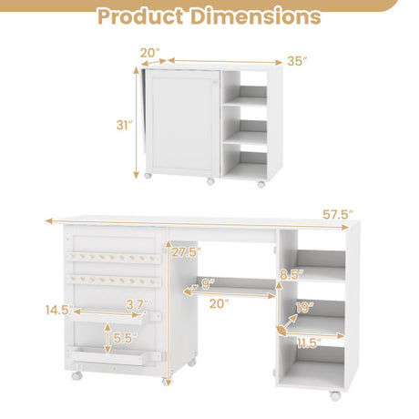 Folding Sewing Table with Storage Shelf and 5 Lockable Wheel-White