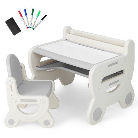 Kids Drawing Table and Chair Set with Watercolor Pens and Blackboard Eraser-Gray
