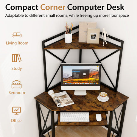 Space-Saving Corner Computer Desk with with Hutch and Keyboard Tray-Rust Brown
