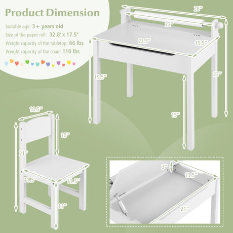Wooden Kids Table and Chair Set with Storage and Paper Roll Holder-White