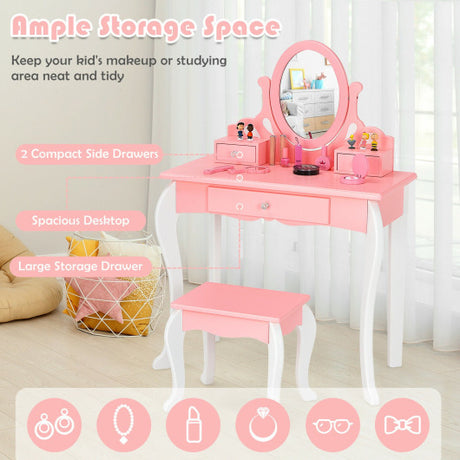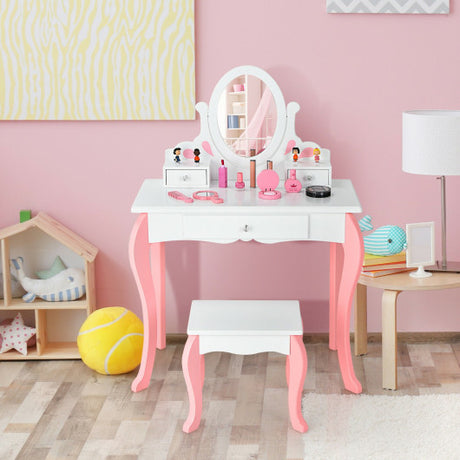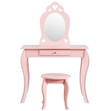 Kids Vanity Princess Makeup Dressing Table Stool Set with Mirror and Drawer-Pink