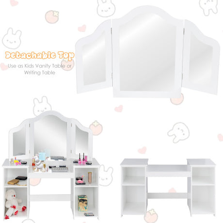 Kids Makeup Dressing Table with Tri-folding Mirror and Stool-White