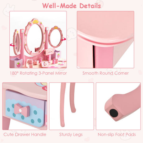 Kids Princess Make Up Dressing Table with Tri-folding Mirror and Chair-Pink