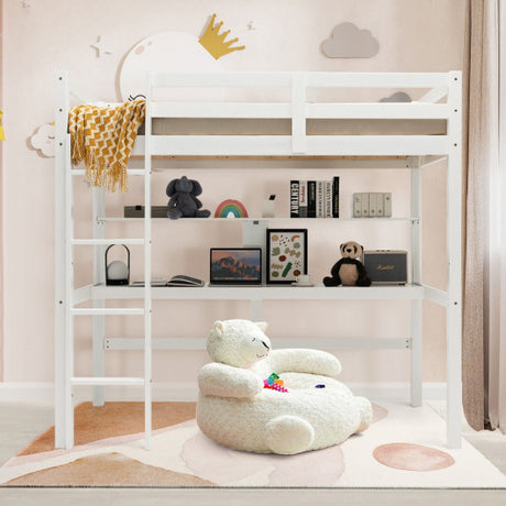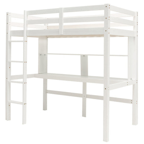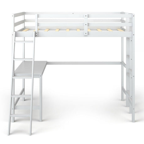 Twin Size Loft Bed Frame with Desk Angled and Built-in Ladder-White