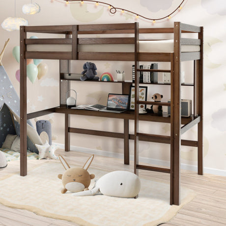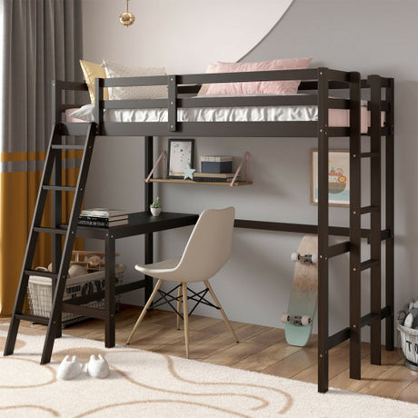 Twin Size Loft Bed Frame with Desk Angled and Built-in Ladder-Espresso
