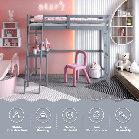 Twin Size Loft Bed Frame with Desk Angled and Built-in Ladder-Gray