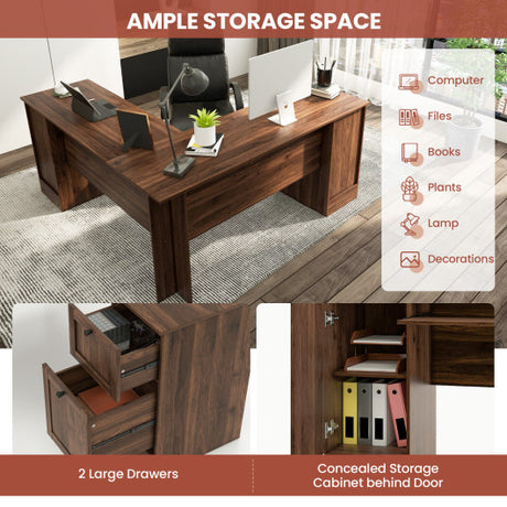L-Shaped Office Desk with Storage Drawers and Keyboard Tray-Walnut