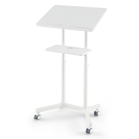 Mobile Lectern Podium Height-adjustable Rolling Laptop Cart with Tilting Top Storage Tray-White