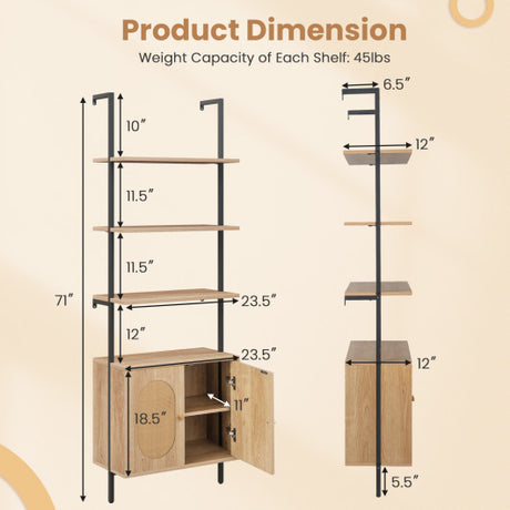71 Inch 6-Tier Wall Mounted Ladder Bookshelf with Rattan Cabinet-Natural