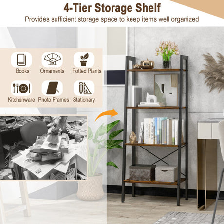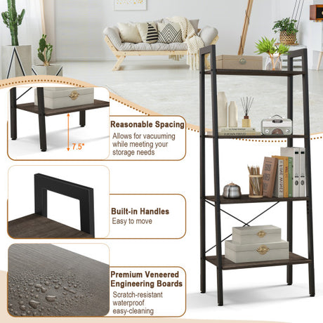 4-Tier Bookshelf with Metal Frame and Adjustable Foot Pads-Rustic Brown