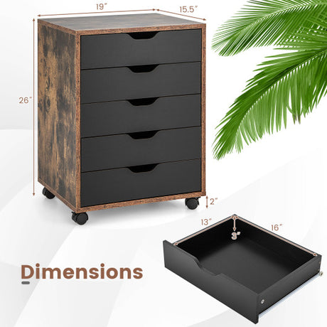 5 Drawer Mobile Lateral Filing Storage Home Office Floor Cabinet with Wheels-Rustic Brown