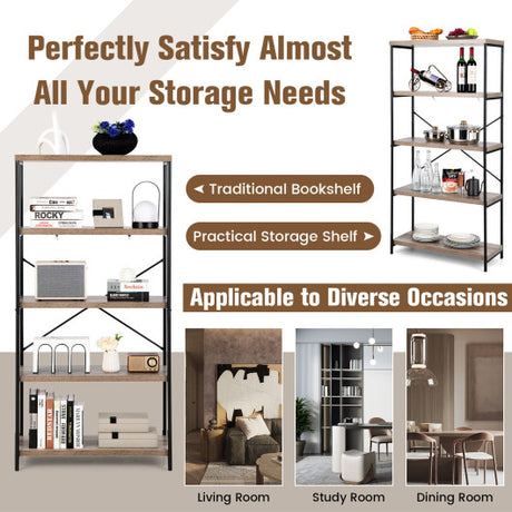 5-Tier Industrial Bookshelf Display Storage Rack with Metal Frame-Gray
