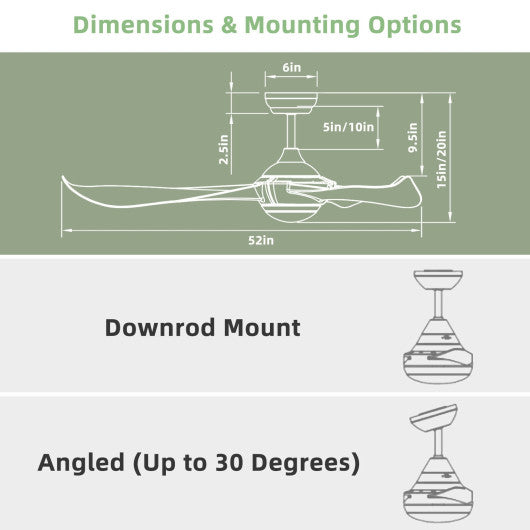 —� Easy to Install: The product provides you with two mounting options----download mount or angled (less than 30 degrees). Installation can be done within 15 minutes. Two downloads (5" and 10€�) are included in the package to choose from. This ceiling fan is suitable for the average room from 20ft x 20ft to 25ft x 25ft.