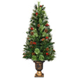 The Christmas tree is a handsome decoration for display in doorways hallways porches and patios. The tree is made of fade-and crush-resistant PVC needles appearing fresh-cut and is pre-lit with warm white LED lights that are energy- saving and long lasting. The equipped gold urn base keeps the tree planted in an upright position. The tree comes with red berries and pine cones with which you can decorate by yourself. The Christmas tree has great quality adding a fantastic festive atmosphere to your home and is your best choice.