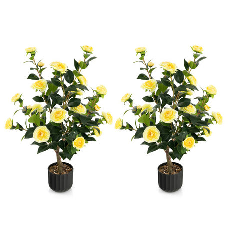 38 Inch Artificial Camellia Tree Faux Flower Plant in Cement Pot 2 Pack-Yellow