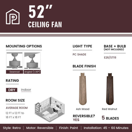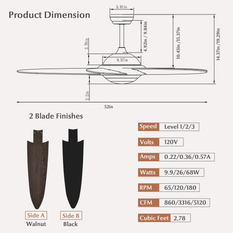 52 Inches Ceiling Fan with Remote Control-Walnut