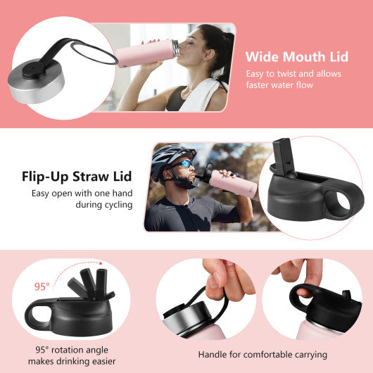 22 Oz Double-walled Insulated Stainless Steel Water Bottle with 2 Lids and Straw-Pink