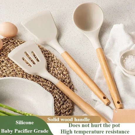Silicone Kitchen Utensil Set with Wooden Handles - Non-Stick, Heat Resistant Spatula and Spoon