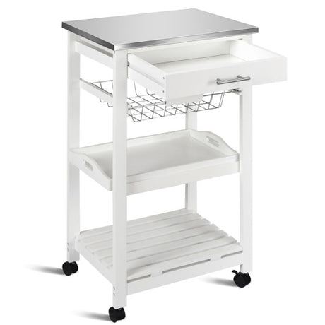 Kitchen Island Cart with Stainless Steel Tabletop and Basket-White