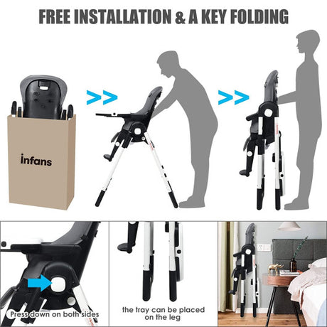 Folding Baby Dining High Chair with Adjustable Height and Recline-Black