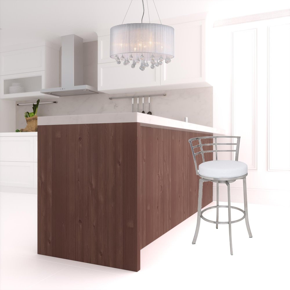 26" White And Silver Faux Leather And Iron Swivel Low Back Counter Height Bar Chair is backordered and will ship as soon as it is back in stock.
