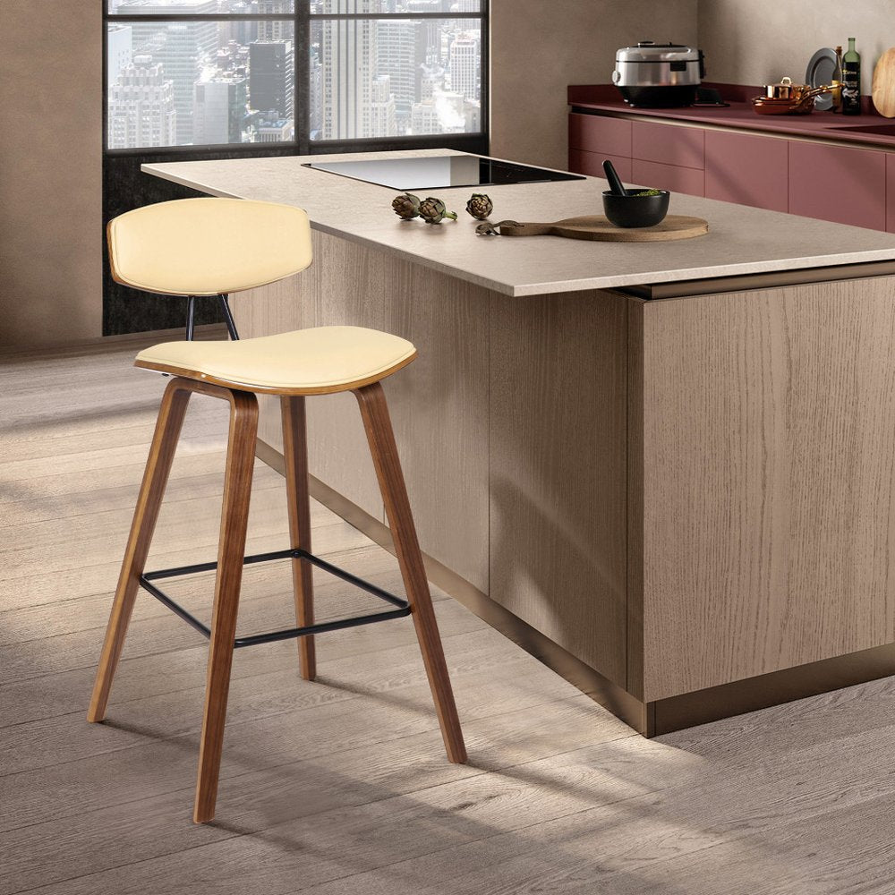29" Cream and Brown Faux Leather and Iron Low Back Bar Height Bar Chair