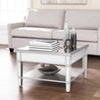 29" Silver Mirrored Square Coffee Table With Shelf is backordered and will ship as soon as it is back in stock.