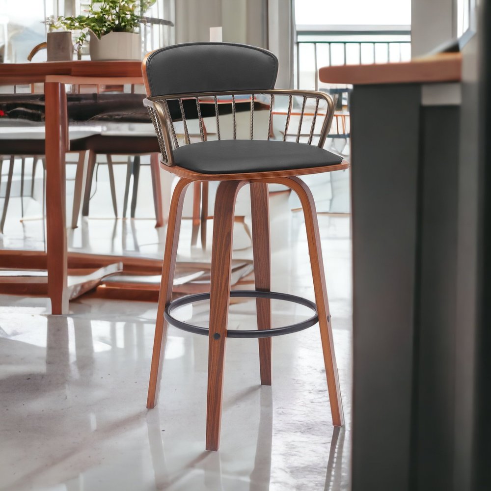 30" Black And Wood Brown Faux Leather Swivel Low Back Bar Height Bar Chair
