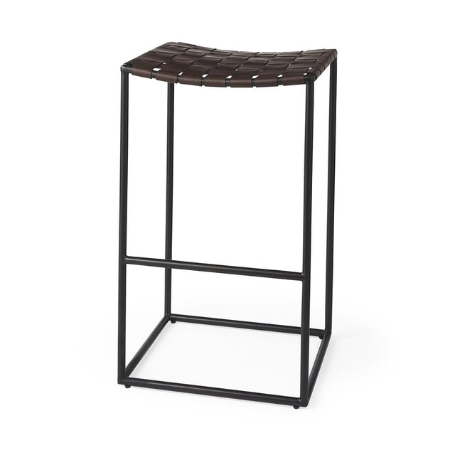 30" Brown And Black Leather And Iron Backless Bar Height Bar Chair