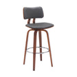 30" Gray And Wood Brown Faux Leather Swivel Low Back Bar Height Bar Chair
