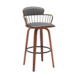 30" Gray And Wood Brown Faux Leather Swivel Low Back Bar Height Bar Chair