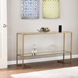 52" Clear and Gold Glass Mirrored Sled Console Table With Shelves