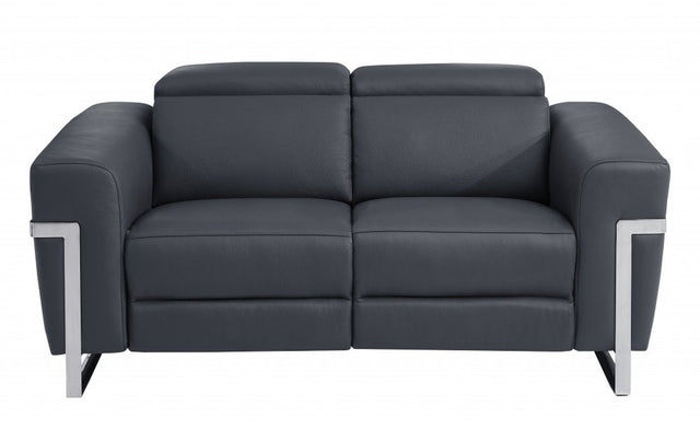 65" Gray And Silver Italian Leather Power Reclining Loveseat - Dark Grey is backordered and will ship as soon as it is back in stock.