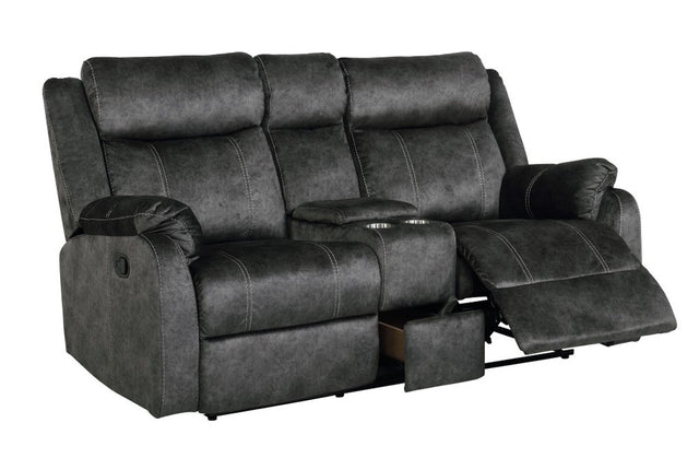 70" Dark Gray Microfiber Manual Reclining Loveseat With Storage is backordered and will ship as soon as it is back in stock.