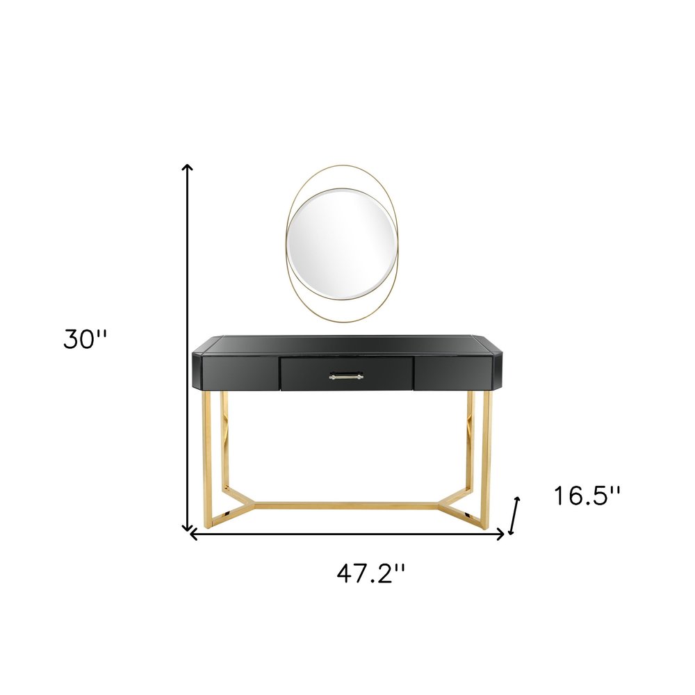 47" Black and Gold Mirrored Glass Frame Console Table And Drawers
