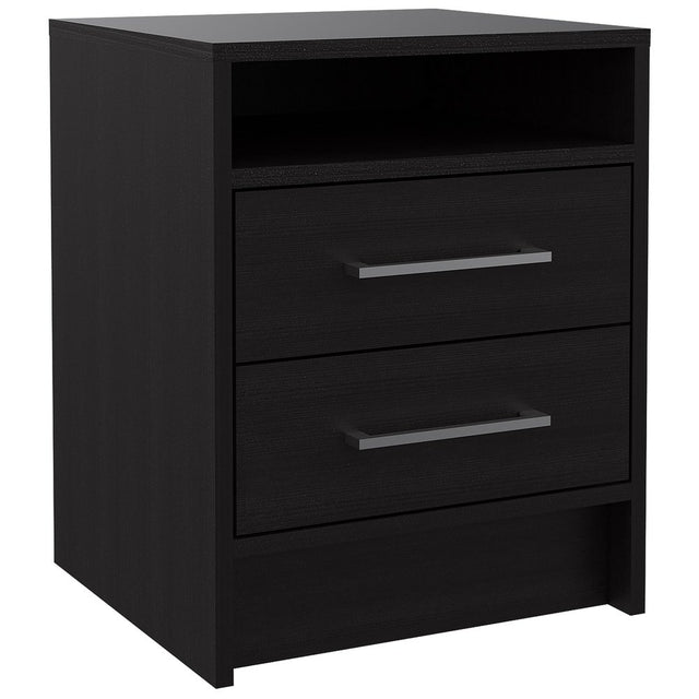 Good looking design and practical styling meet to form this 20-inch wood two drawer nightstand. Sturdy and durable construction from manufactured wood ensures this trusty bedside table is built to last. This piece has 2 drawers for your storage needs. An easy-access shelf gives you additional storage and display space. The unsung hero of the bedroom, this nightstand is perfect for keeping a glass of water, lamp, alarm clock, jewelry, and more, close by and easily accessible. 19.9-inch h x 15.7-inch w x 14.7-inch d.