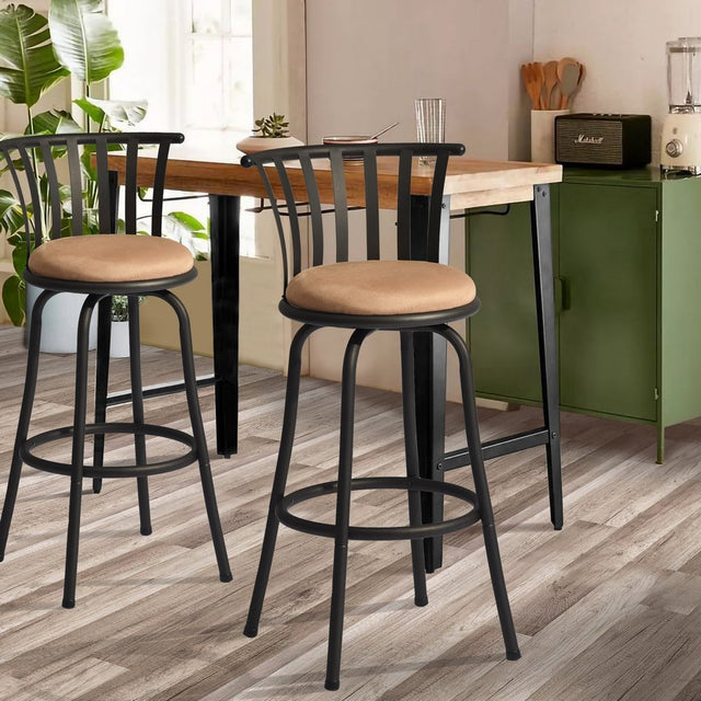 Set of Two 29" Brown and Black Microfiber and Metal Low Back Bar Height Swivel Bar Chairs