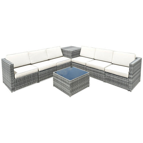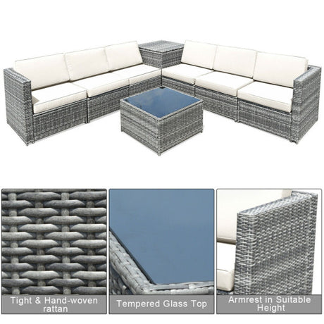 8 Piece Wicker Sofa Rattan Dinning Set Patio Furniture with Storage Table-White